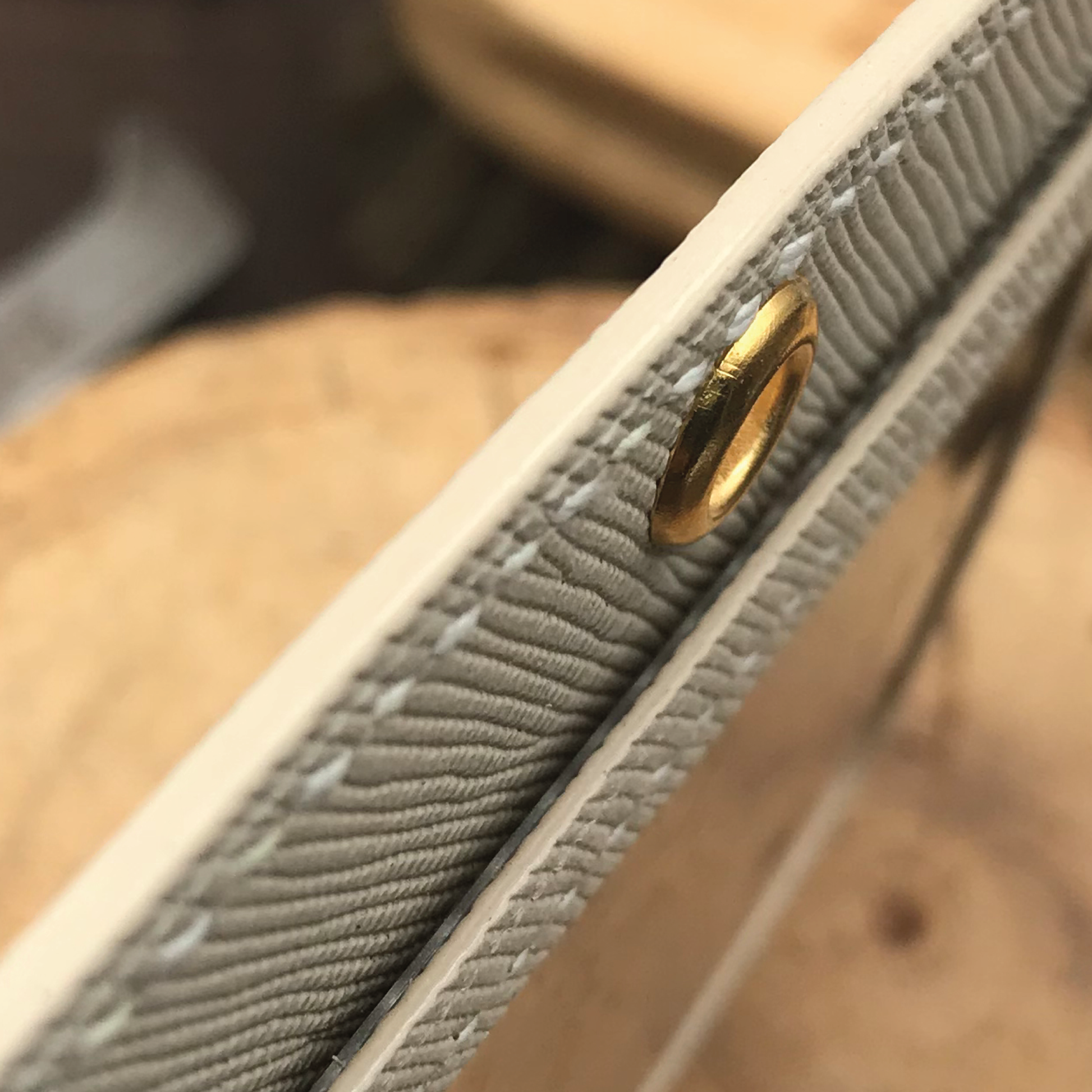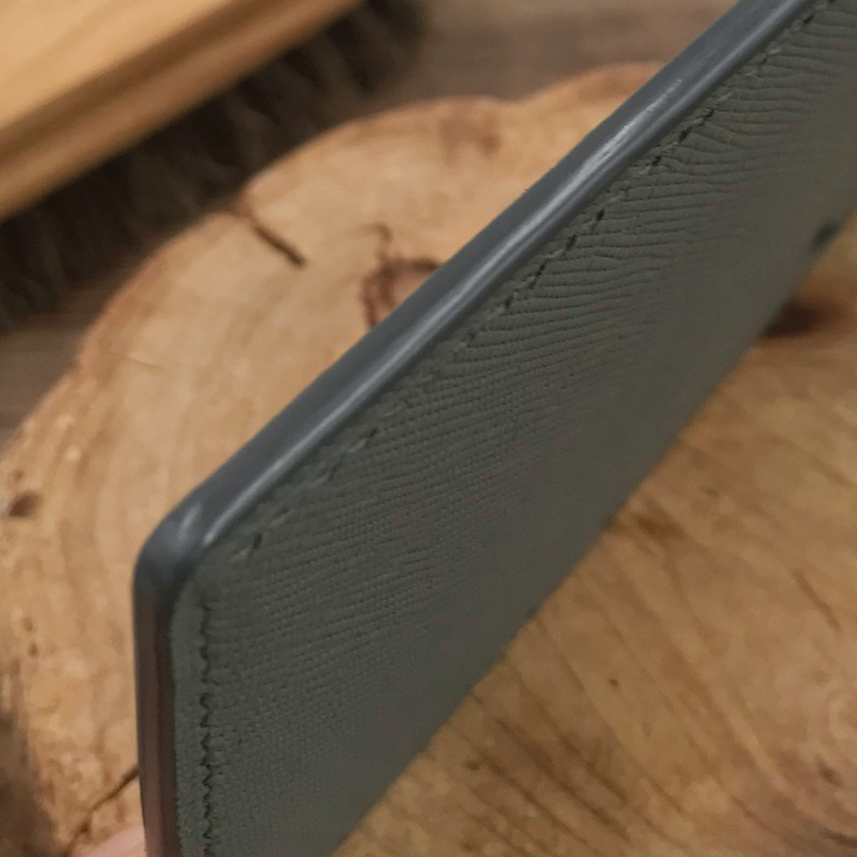 這種傳統工藝結合皮革邊緣的折疊與壓邊處理,打造出光滑圓潤的邊緣造型。不僅展現精湛的手工技藝,更賦予皮革優雅細緻的質感,並隨時間推移,逐漸形成獨特的自然光澤。這種工藝我們通常用於植物鞣製皮革,能充分展現其原始風貌與經典魅力。